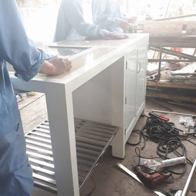 Khu bếp được bố trí gọn gàng có cả đảo bếp rộng để chế biến thực phẩm và làm bàn ăn sáng. |